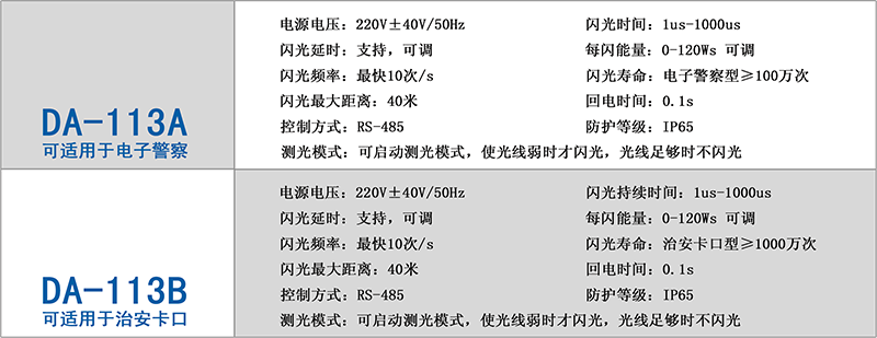 鼎光 DA-113系列數(shù)字閃光燈通過RS-485接口實現(xiàn)閃光燈的數(shù)字化控制,設定實際所需要的閃光參數(shù):閃光時 間1us-1000us內(nèi)任意可調(diào);支持閃光觸發(fā)延時,延時的時間可調(diào);可啟動測光模式,在光線弱時自動啟動閃光功 能或自動調(diào)節(jié)曝光參數(shù),保證不同光照下最佳的拍照效果;支持現(xiàn)場和遠程設置參數(shù),閃光燈的特點是功能齊全, 可適用于各種智能交通抓拍系統(tǒng)的需要。是目前市場上電子警察、治安卡口升級改造的首選閃光燈。鼎光 DA-113 系列數(shù)字閃光燈分為兩個版本,具體參數(shù)如下: