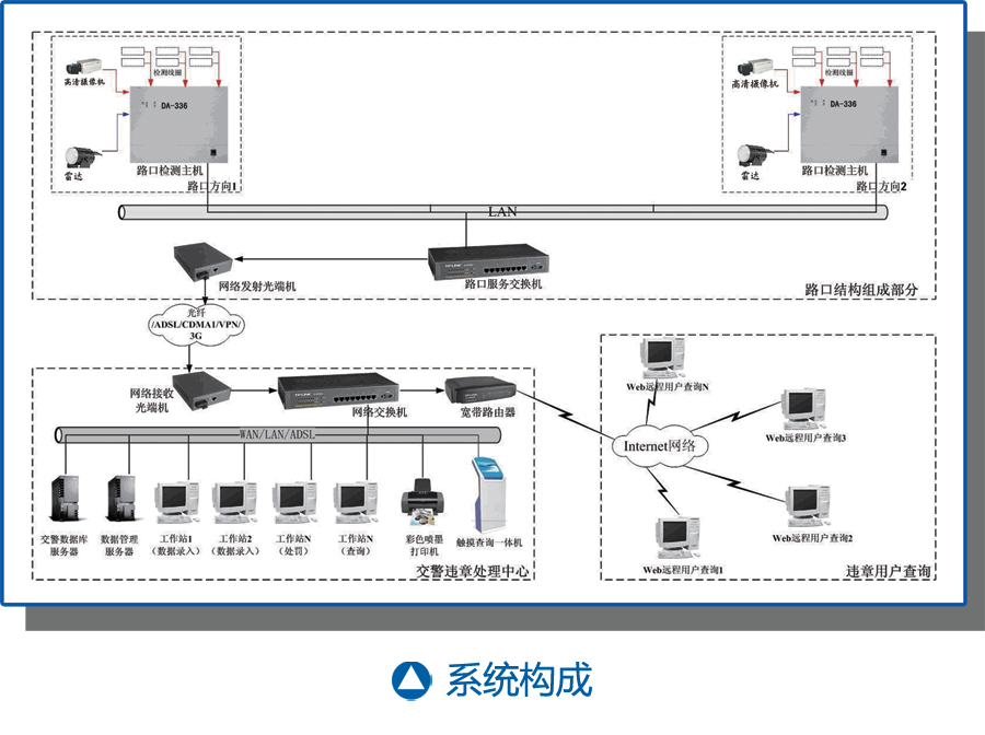 DA-366公路車輛智能監(jiān)測(cè)(區(qū)間測(cè)速)自動(dòng)記錄系統(tǒng)由二套及以上的前端系統(tǒng)構(gòu)建區(qū)間測(cè)速點(diǎn),準(zhǔn)確記錄通過車輛的時(shí)間及圖片,通過自動(dòng)識(shí)別軟件提取車牌等相關(guān)信息,并將這些信息匯總到后臺(tái)服務(wù)器的數(shù)據(jù)庫(kù)處理。前端系統(tǒng)由車輛通過檢測(cè)單元、車輛通過監(jiān)控程序(儀表)、抓拍設(shè)備、主控程序、地感線圈組、閃光燈組件等部分組成。各個(gè)前端處理系統(tǒng)和后端系統(tǒng)以TCP/IP的方式組成局域網(wǎng),構(gòu)成完整的DA-356A區(qū)間測(cè)速自動(dòng)記錄系統(tǒng)。前端采集到的車輛違法圖片被分類存儲(chǔ)在斷面服務(wù)器,圖片通過聯(lián)網(wǎng)將圖片傳送至后端系統(tǒng),完成車牌識(shí)別、入庫(kù)處理后,到達(dá)數(shù)據(jù)、控制中心,傳輸網(wǎng)絡(luò)可以是光纖、ADSL或其它有無線網(wǎng)絡(luò),并具備斷點(diǎn)續(xù)傳功能。